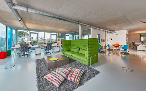 freiheit公司的文化精神通過室內(nèi)的裝飾材料和形式得以表達(dá)。組織團(tuán)隊(duì)的開放辦公區(qū)裝點(diǎn)以超大型的木制工作臺(tái);這里配有生活廚房、大禮堂以及亮麗的創(chuàng)客空間,隨手涂寫的黑板墻、大型木制工作臺(tái)、甚至還有壁爐,公司的程序員都在這個(gè)頂層空間共同辦公、合作與休閑交流。
