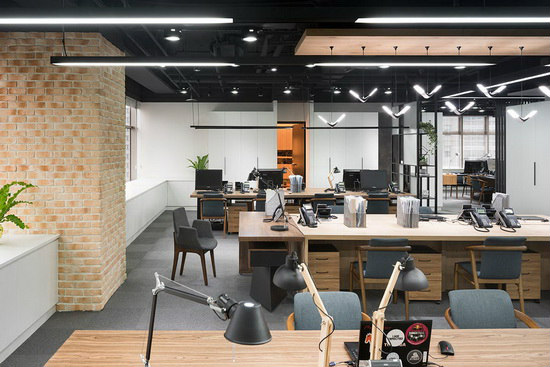 3、現(xiàn)代時尚的主題辦公室設(shè)計案例:以現(xiàn)代時尚的主題表達團隊形象,透過空間的通盤整合,延伸辦公場域的使用尺度,也讓行走動線更流暢。空間中運用溫暖的元素,如文化石與天然木質(zhì)等,細膩營造場域內(nèi)的質(zhì)樸與舒適感。設(shè)計師以整排矮柜的方式保留對外采光,兼具收納機能與對外的流通性。