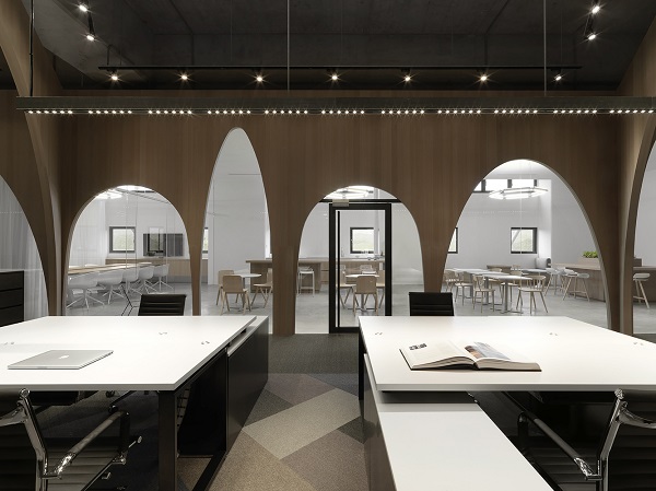 2、考慮到辦公室裝修需要的空間性。設(shè)計師結(jié)合自身創(chuàng)意,設(shè)計了一個個用柱子支撐的空間結(jié)構(gòu),就像巴黎教堂的穹頂一般。巨大的柱子帶來的大跨度和場地的高屋頂以及隨處可見的鏡面和玻璃隔板,創(chuàng)造出一個兼具創(chuàng)造性和實用性的辦公室空間。整個辦公室設(shè)計被稱為“修道院”,包括一個L型的大廳,周圍的拱廊,一面面對建筑的室內(nèi)并且可以遠望的庭院。通過創(chuàng)造人體尺度的辦公空間小組和放松的其他區(qū)域,這項辦公室設(shè)計既滿足了辦公所需的私密性,同時又保持了一種中性的工作環(huán)境。