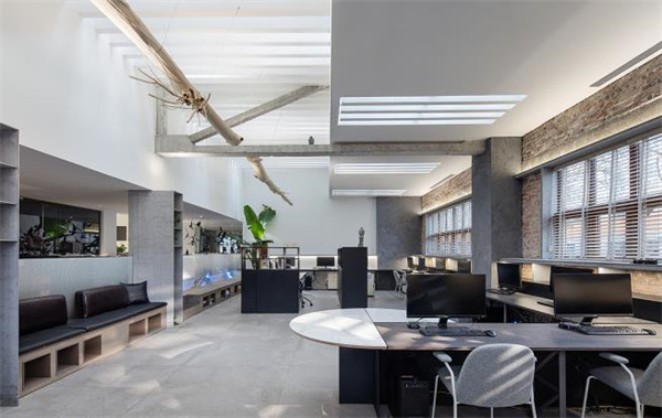 700平米的辦公室裝修設(shè)計(jì):設(shè)計(jì)師們保留了老建筑的原始磚墻,只對(duì)吊頂做了百葉格柵的造型設(shè)計(jì),與陽(yáng)光順向的造型也起到了調(diào)節(jié)空間光線的作用,另外這個(gè)地方我們還吊掛了一棵一分為二的大樹(shù)。使用率較高的地方叫做“工作空間”,把較好的南北方向空間給到整個(gè)的工作空間,用較流暢的動(dòng)線來(lái)組合這個(gè)部分?!爸獠繀^(qū)域”是我們提出來(lái)的一個(gè)概念,這一部分區(qū)域完成的是企業(yè)合作伙伴在工作中的協(xié)同作戰(zhàn)訴求,其應(yīng)該被設(shè)置在有獨(dú)立出入口的中部空間?!靶蜗髤^(qū)域”是企業(yè)面對(duì)客戶的精神堡壘,我們會(huì)將其設(shè)置在空間的重點(diǎn)區(qū)位。在辦公室的后邊有一條單獨(dú)的樓梯通往樓下的茶室,也就是在一個(gè)30平米的位置中,又可以重新組成一個(gè)封閉的LOFT空間,滿足我一個(gè)人的創(chuàng)意設(shè)計(jì)和客人接待需要,這個(gè)算是留給自己的一點(diǎn)小私心。