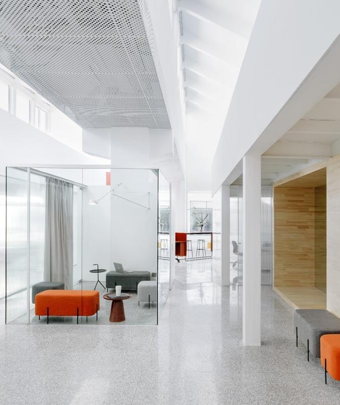 某創(chuàng)意園區(qū)辦公室裝修茶水間設(shè)計(jì):將茶水間放置在兩翼的樞軸上意圖在于是其成為辦公室的社交中心,同時(shí)可以通過全玻璃立面欣賞到花園景觀。茶水間的前面有一個(gè)服務(wù)區(qū),儲(chǔ)藏食品的同時(shí)設(shè)置了服務(wù)器室、門衛(wèi)室、浴室、淋浴間和洗滌區(qū)。辦公室的設(shè)計(jì)爭取較大化每個(gè)部門的利益: 例如會(huì)計(jì)和管理或許會(huì)需要一個(gè)非常私人的辦公室,又或?;?dòng)和溝通的部門需要一個(gè)開放的空間配置。紅色密度板圍合出來的盒子隱藏著兩個(gè)CEO的辦公室,他們可以享受大棚子的自然光和全高窗戶的花園景觀。