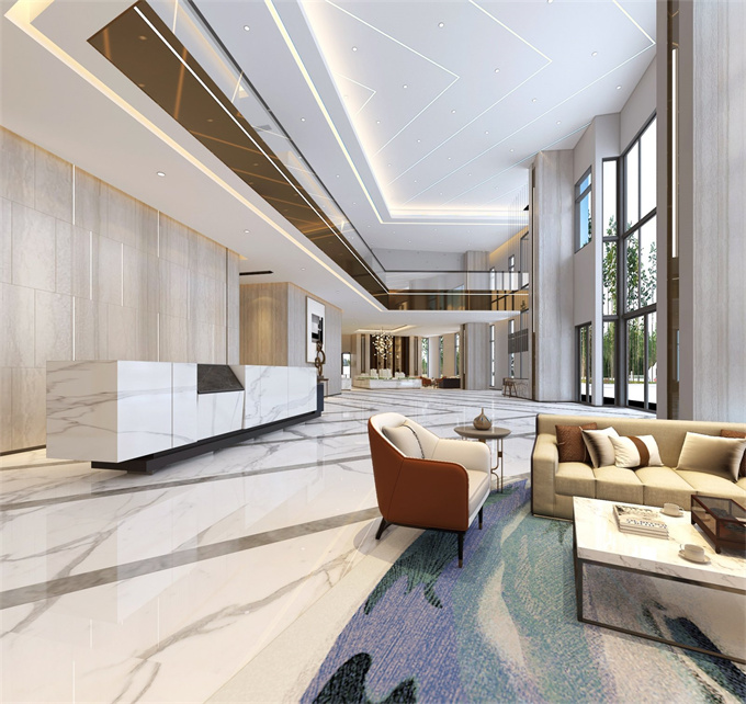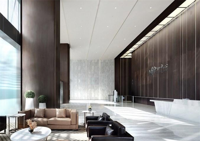 2、高端辦公樓設計案例:設計師以國際化視野,融入項目所處城市地方特色,結(jié)合自然、創(chuàng)新、智慧的辦公設計理念,將城市中的光影、山、水、設計元素抽象表達。大堂摒棄繁雜的立面造型及材料的裝飾,利用材質(zhì)本身的質(zhì)感、顏色與光感產(chǎn)生對比,使室內(nèi)空間形式與建筑結(jié)構(gòu)表現(xiàn)達到優(yōu)雅的平衡。白色大理石接待臺現(xiàn)代、簡潔、時尚,即能滿足功能需求,又能體現(xiàn)裝飾的現(xiàn)代與美感。