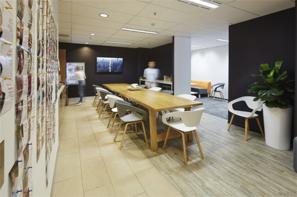 5、服裝公司辦公室裝修設計:接待處位于底樓的正門,設有休息室和會議空間,可容納訪客。接待區(qū)周圍的定制墻板模仿了織物的褶皺,并為零售品牌的工作場所提供了設計敘事。提供各種團體座位安排的所有團隊成員的共用食堂位于地下室。開放式辦公室和休息區(qū)沿著面向公園一側的全高立面玻璃排列,使員工在工作期間可以欣賞郁郁蔥蔥的綠色美景。玻璃隔斷用于將會議室、私人櫥柜與開放辦公室分隔開來,充分利用自然光線,創(chuàng)造一個透明通風的工作場所。白色、灰色和黑色的基本色調(diào)與天然的木材和石材表面作為重點,為工作場所的創(chuàng)造性工作創(chuàng)造了一個干凈和舒適的背景。墻面紡織面板和天花板護罩可確保共享空間和封閉空間所需的聲學特性。