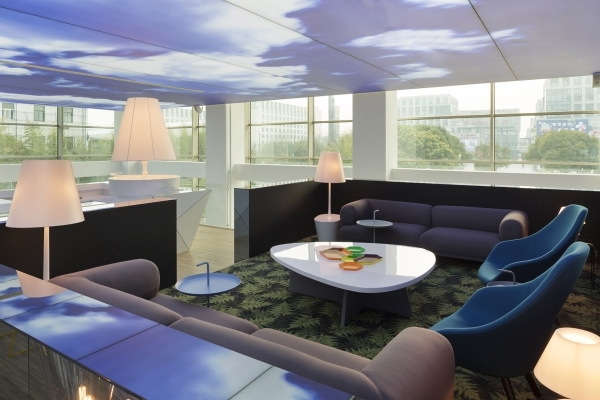 盡管這是個室內空間,裝修設計師仍希望通過大自然的圖案為來客營造舒適的感覺。天空圖案的天花,樹形的支柱,植物圖形,明亮的淺色調,木制材料和流線型的花園等,這些眾多的元素都將這個展廳裝點得與傳統(tǒng)意義上的售樓展廳與眾不同。