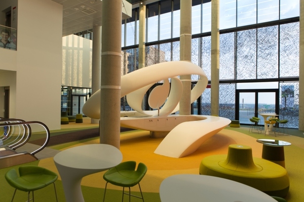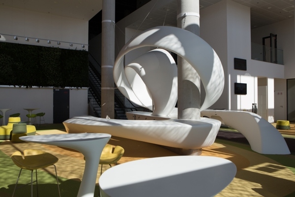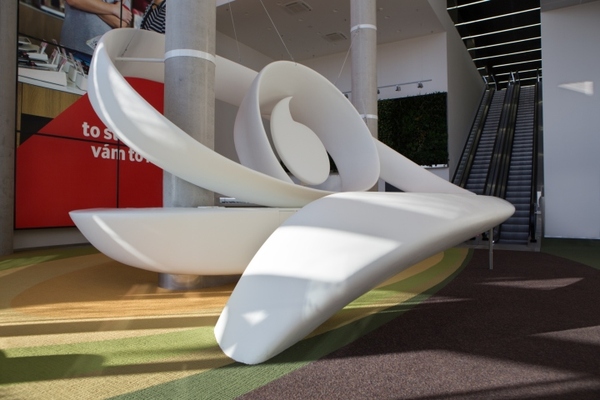 沃達(dá)豐公司期待的,是一個(gè)能夠展示出燦爛明天,并且能夠表明公司對(duì)未來(lái)前景信心的入口大廳。這個(gè)非同一般的大廳里,*引人注目的使那個(gè)三層樓高的藝術(shù)雕塑作品。