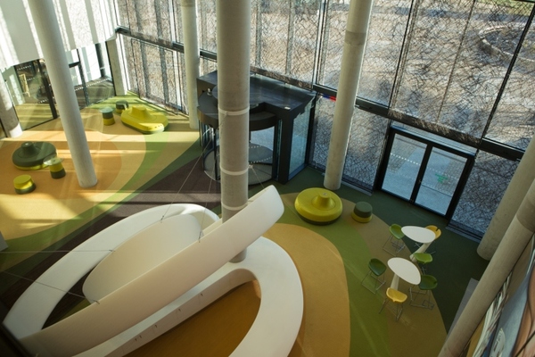 大廳和一樓之間的實(shí)體連接,是通過(guò)扶手電梯來(lái)完成的。大廳的南面采用玻璃幕墻,跟墻外的街道形成一種交互。中央那個(gè)形狀獨(dú)特的前臺(tái)接待桌,把大廳整個(gè)平面的布局規(guī)劃的像是一幅圖畫。設(shè)計(jì)師專門使用一些能夠給人帶來(lái)柔軟感覺(jué)的材料,比如人造的草皮,還有那些好像是生長(zhǎng)在柱子和家具上的苔蘚和地衣。