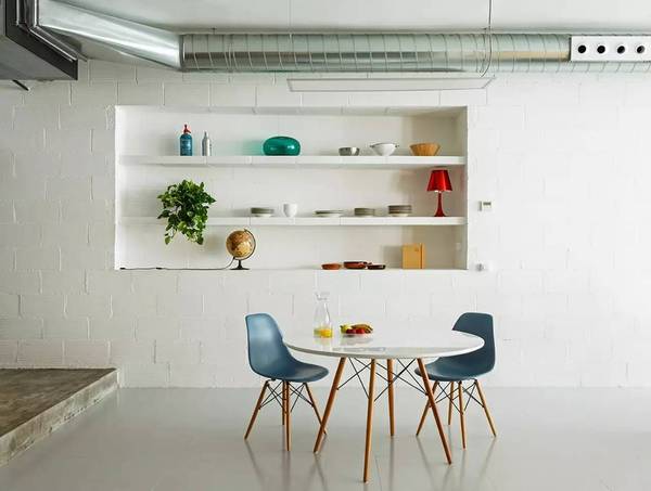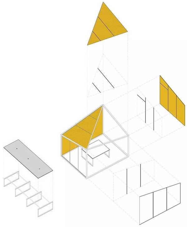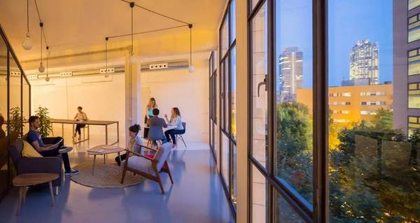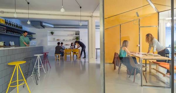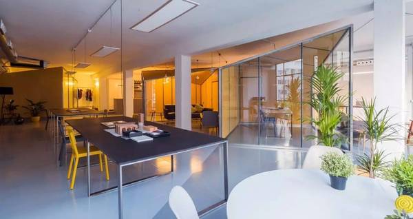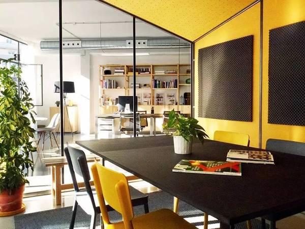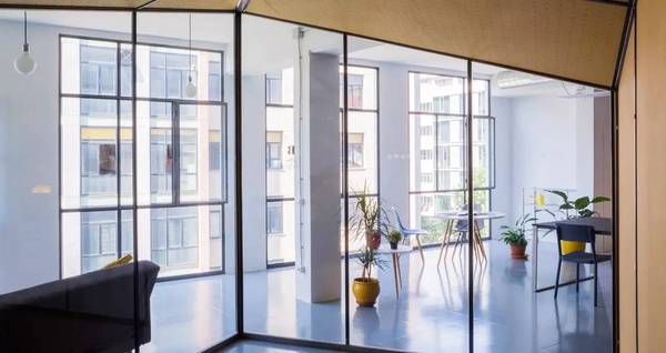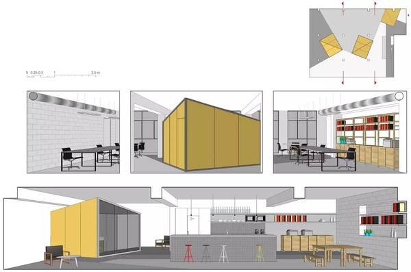此空間是一個由鋼筋混泥土柱子和懸梁支撐的300平米大開敞空間。結(jié)構(gòu)由三個中心線組成,清楚地配備了所需的功能計劃:兩個辦公室位于相對的兩側(cè),公共會議室和休息區(qū)在中心。