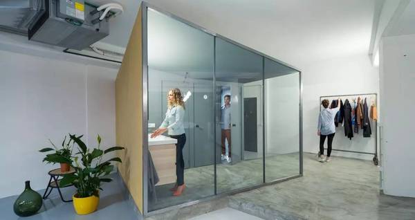 正交排布的網(wǎng)狀結(jié)構(gòu)體系和模塊化的立面相結(jié)合使中間的區(qū)域比兩邊要窄,為布置兩個相似的辦公室制造了難度。建筑師決定在空間中插入三個塊狀空間,其中兩個用于會議,另一個用作衛(wèi)生間。其獨立于原有空間存在,使空間更有層次和秩序感。