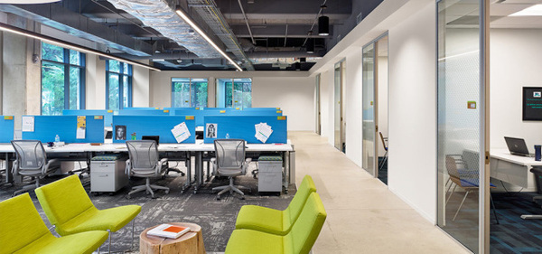 時(shí)尚辦公網(wǎng)很喜歡咖啡吧和休息室的設(shè)計(jì),巧妙的運(yùn)用不規(guī)則幾何造型,再涂刷以Bazaarvoice的品牌色系如:草綠、海藍(lán)、天藍(lán)和青色,讓整個(gè)空間充滿了清新活力。室內(nèi)還特別設(shè)計(jì)了一處名為 “Help Desk” 的網(wǎng)絡(luò)技術(shù)服務(wù)中心,實(shí)木的墻面、實(shí)木的格柵吊頂,配以黑色熱軋鋼制作的吧臺(tái)和溫暖的光照。