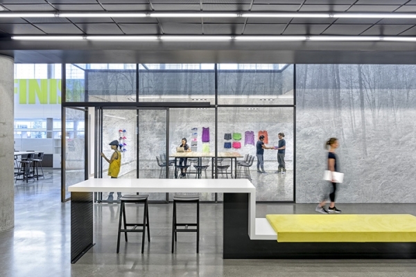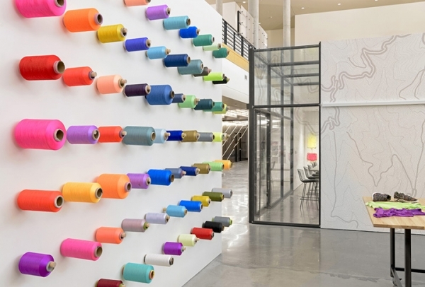 因為是運動服飾研發(fā)公司,因此類似面料、橡膠、紗線、還有鞋子等物品即需要儲存的地方,也要便于隨時觀摩。儲物柜是一種解決方案,但O+A提出更好的創(chuàng)新方案。當設計團隊在現(xiàn)場考察的時候被儲物盒中靚麗的紗線色彩所吸引。一個個漂亮的線軸被精心裝飾于墻面上,形成一道裝置藝術墻。