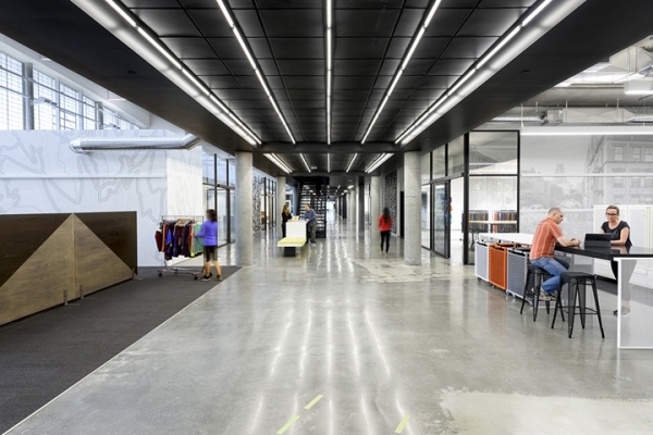 設計師在其辦公室裝修設計中,巧妙地植入了運動品牌的元素。代表運動的四根跑道元素,由地面輾轉延伸至頂面照明設計,體現(xiàn)出Nike的運動基因。密林深處為主題的空間主要用于工作室和協(xié)作區(qū),代表了探索和即興發(fā)揮。繪有城市建筑風情的主題空間是中心大廳也是會議空間。