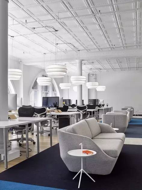 整個(gè)辦公區(qū)成L形布局,一條由藍(lán)灰相間的瓷磚鋪成的通道將員工迎入辦公區(qū),辦公區(qū)擁有*多的自然光照,同時(shí)來自于Rich Brilliant Willing公司巨大的燈具為整個(gè)辦公空間在晚間提供舒適的照明環(huán)境。會(huì)議室結(jié)合歐式與美式兩種風(fēng)格,簡潔時(shí)尚的特點(diǎn),為空間增加了透明感?;疑玀oroso沙發(fā)和白色Anglepoise經(jīng)典燈具的休息區(qū),則為員工提供了舒適的飯后咖啡與休憩空間。