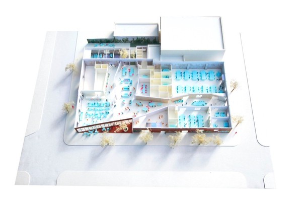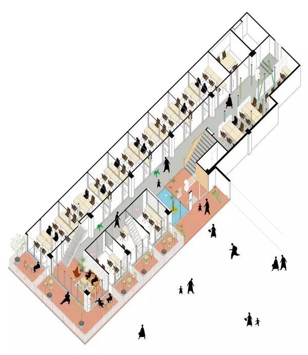 這樣的設(shè)計(jì)手法,給予室內(nèi)空間相互關(guān)聯(lián)。同時(shí),設(shè)計(jì)者還對(duì)建筑入口進(jìn)行了從視覺化的處理,移除面向西南角的三角形的區(qū)域,改為透明的立面,將被涂鴉的磚墻重新組裝,以制造出不同的涂鴉樣式,以此表現(xiàn)建筑以及社區(qū)間層層疊加以及穿插的歷史。