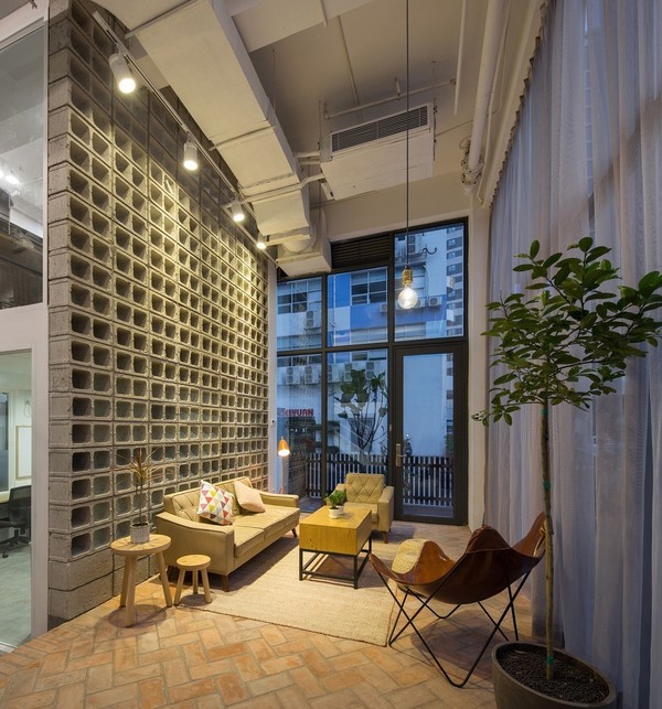 由一十一建筑改造設(shè)計(jì)的位于深圳的一棟聯(lián)合辦公空間,建筑由一棟工業(yè)建筑的首層一部分改造而來。由于室內(nèi)具有很高的天花,在確保自然光線能達(dá)到場(chǎng)地較深區(qū)域的前提下,設(shè)計(jì)者在局部區(qū)域設(shè)計(jì)了夾層。利用天花的高度,創(chuàng)造出更多的變化形式。同時(shí),利用一系列戶外建筑材料使用在室內(nèi)空間,作為重要公共區(qū)域的特色景觀墻,紅磚在室內(nèi)于室外的連續(xù)鋪設(shè),以模糊室內(nèi)外邊界和處理高差。