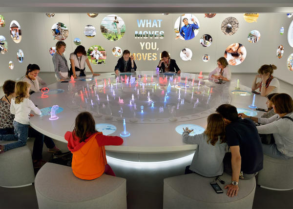 象征當(dāng)下的Forum部分,通過交互式裝置,讓觀者意識(shí)到營養(yǎng)與健康行業(yè)的社會(huì)責(zé)任。象征未來的Visions部分,參觀者可以通過游戲和虛擬現(xiàn)實(shí)來體驗(yàn)科學(xué)家的熱情和他們創(chuàng)意十足的發(fā)明。在一次次的互動(dòng)體驗(yàn)后,參觀者可以通過此次展會(huì)場地的辦公室裝修與設(shè)計(jì)所傳達(dá)出的理念以及自己的感悟來體會(huì)這個(gè)企業(yè)關(guān)于過去、現(xiàn)在和未來的每一段旅程,感受著一百五十年的歷史所蘊(yùn)含的雀巢精神。