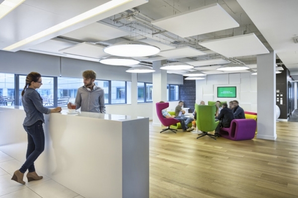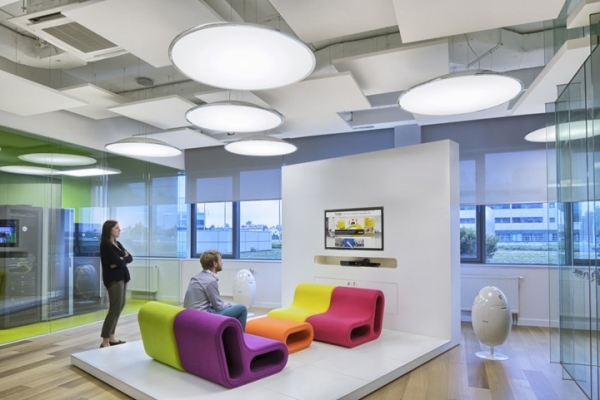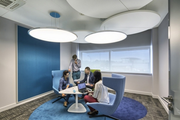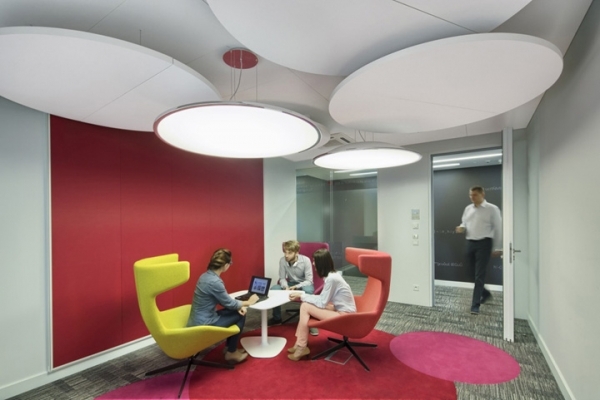 多彩的協(xié)作空間,圓形的頂與圓形的燈上下交錯(cuò)構(gòu)筑了一個(gè)動(dòng)感有趣的視覺(jué)空間,并與地面圓形的地毯形成形式上的呼應(yīng);而墻面局部點(diǎn)綴的色彩也與彩色地毯相映成趣。流暢的圓弧造型和曲面高靠背椅帶來(lái)柔和優(yōu)雅的工作氛圍。