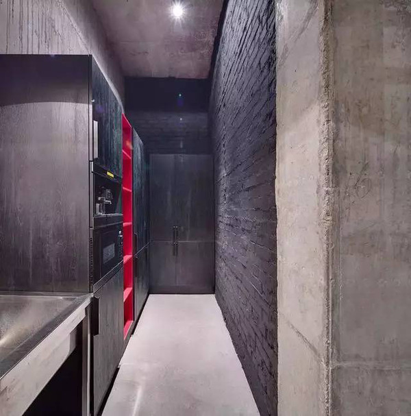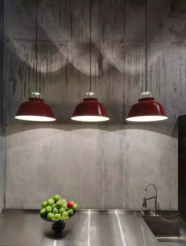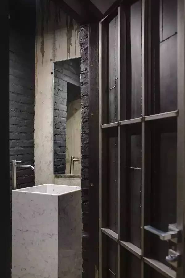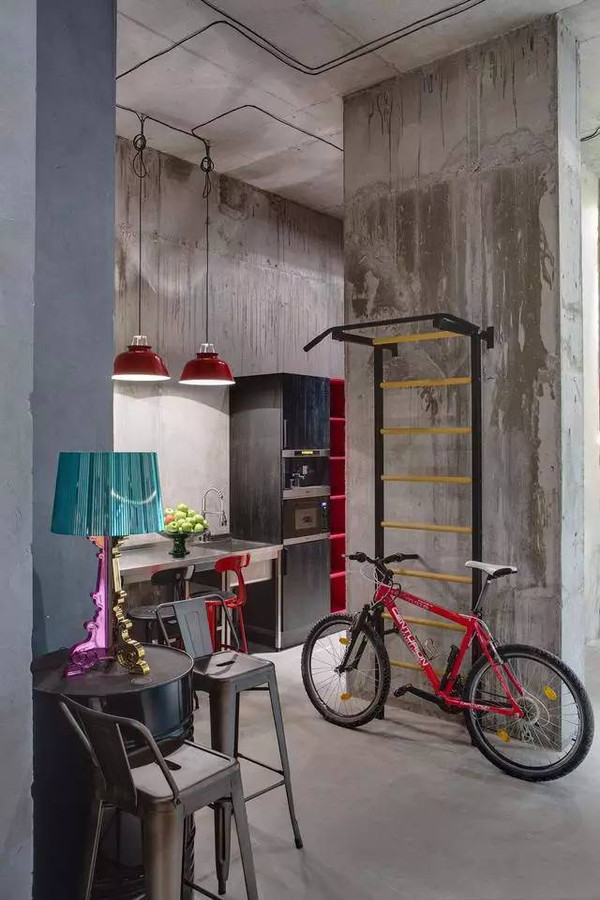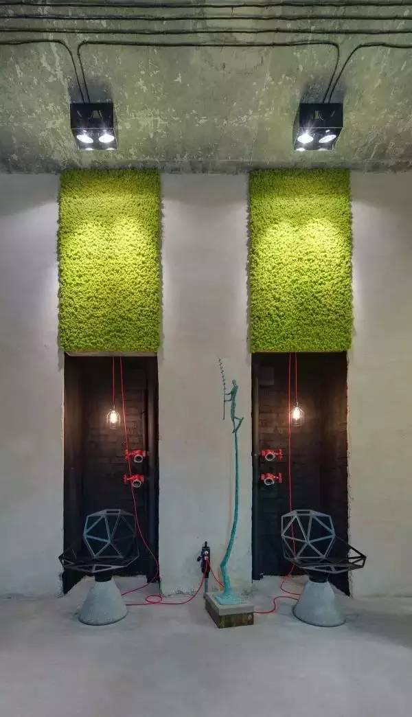 裸露的水泥墻面和水管閥門,被很好的歸納起來,成為了裝飾墻,綠色的塊毯成了一個亮點被掛在墻上,效果相當(dāng)棒