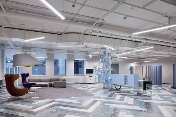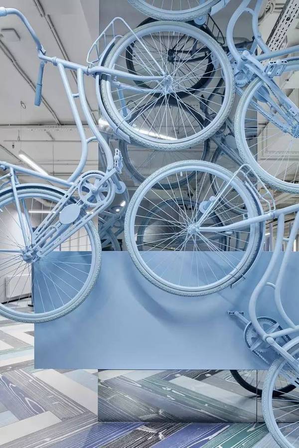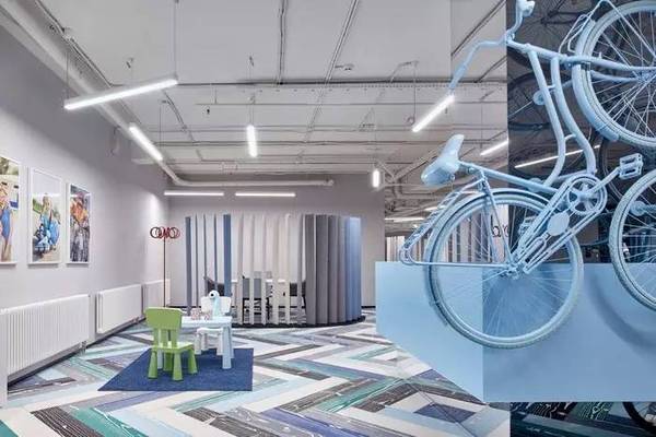 這種梯級(jí)的色彩配比猶如美麗的風(fēng)景畫(huà)一般令人賞心悅目,也再次點(diǎn)明本案的設(shè)計(jì)主題:運(yùn)動(dòng)、青春、以及浪漫主義的藝術(shù)情懷。接待臺(tái)旁邊那一組粉藍(lán)色自行車(chē)藝術(shù)裝置再次強(qiáng)化了這個(gè)設(shè)計(jì)主題。接待區(qū)的多元混搭組合設(shè)計(jì),也在向大家傳遞這是一個(gè)多功能綜合型的辦公室屬性。