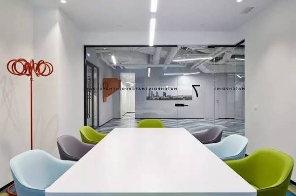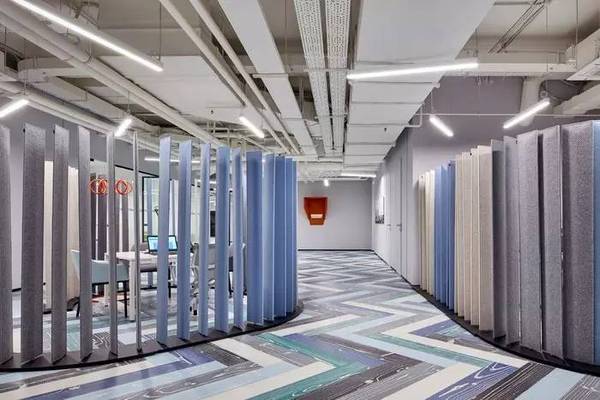 沿墻布局的會(huì)議室、辦公室等獨(dú)立空間與開(kāi)放區(qū)域僅由通透的玻璃做隔墻,以保證空間在視覺(jué)效果上的連貫和完整性。并且這些獨(dú)立空間的頂和墻不做任何其它修飾,只在地面的地毯拼貼上延續(xù)整體的色彩搭配。