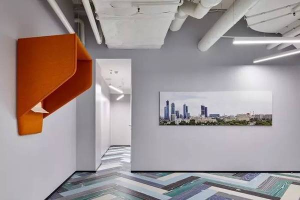 辦公場(chǎng)地的前身是一個(gè)停車(chē)場(chǎng),頂面有著眾多龐雜的管道系統(tǒng)。設(shè)計(jì)師的解決方法是首先把整個(gè)室內(nèi)空間全部噴成白色,包括所有的孔隙、格子以及頂面眾多的機(jī)電管道。清一色的白色噴涂令原本雜亂無(wú)章的空間成為一個(gè)干凈明亮的視覺(jué)整體。隨后,設(shè)計(jì)師為這個(gè)純凈的空間注入他們?cè)诒景杆磉_(dá)的創(chuàng)意主體和色調(diào):漂亮的地面設(shè)計(jì)。采用仿木地板的瓷磚,分別制作成藍(lán)色、灰色、綠色、白色、黑色,幾組色彩以人字紋交錯(cuò)排列,在偌大的空間里形成**動(dòng)感和視覺(jué)魅力的空間效果。