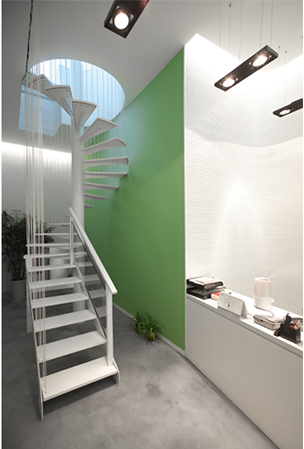 裝修的色彩并不是多種顏色搭配呈繽紛靚麗的景象,而是簡(jiǎn)單的青綠色為主題,經(jīng)典黑白色輔助映襯。綠色的裝修裝飾給人青春活力的感覺,用在這里再合適不過了。其次是樓梯的造型設(shè)計(jì),圓形旋轉(zhuǎn)樓梯,造型上的別致同樣也帶來了異樣的體驗(yàn)。