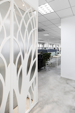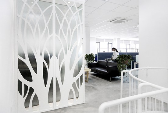 辦公室裝修的屏風(fēng)設(shè)計(jì)不僅僅是處于玄關(guān)的作用而設(shè)置,也有著很大的裝飾作用。鏤空的樹形結(jié)構(gòu)造型設(shè)計(jì),一層模糊的鋼化玻璃,隔絕視線的同時(shí),也營(yíng)造了一個(gè)朦朧而富有趣味性的室內(nèi)空間。