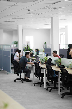 辦公區(qū)域的設(shè)計(jì)是整個(gè)公司里*為自由的區(qū)域,工位連成一片但是距離的保持并不會(huì)讓人覺得狹窄擁擠,沒有過分拘束的辦公氛圍讓員工大可以卸下緊張情緒,輕松辦公。綠色植物盆栽在室內(nèi)隨處可見,飛拓企業(yè)對(duì)于裝飾及綠化的重視程度可見一斑。