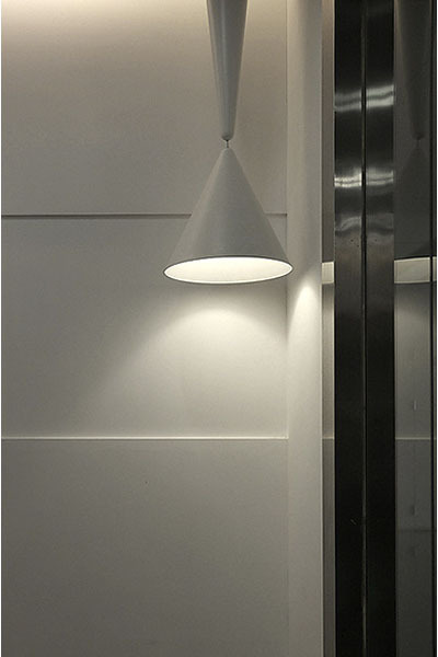 墻面的錯格設(shè)計非常有層次感,簡單的設(shè)計并非沒有看點,設(shè)計師改變環(huán)境外觀的方法手段數(shù)不勝數(shù);但是能通過極為簡單的手法讓環(huán)境從簡樸中透漏出深厚的內(nèi)涵,這就是一件比較考驗技巧的事情。而圖中的圓錐造型吊燈,便是這一空間設(shè)計的亮點所在.