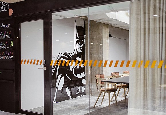 背景墻設計里有很多蝙蝠俠、綠巨人、超人等影視漫畫元素。