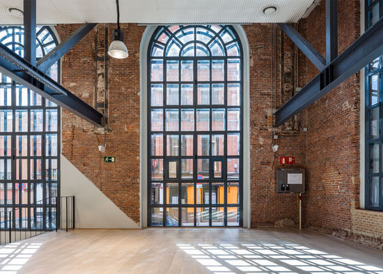 Jump Studios 需要改造的是位于馬德里的一所 19 世紀(jì)的電池工廠,有五層樓高,一些地方還保留了老式的紅磚墻。他們?cè)趯?duì)整個(gè)樓進(jìn)行完全檢查后對(duì)區(qū)域做出了重新的布局,在北邊開辟了一個(gè)新的入口,用了有現(xiàn)代感的黑色金屬且貫通兩層。