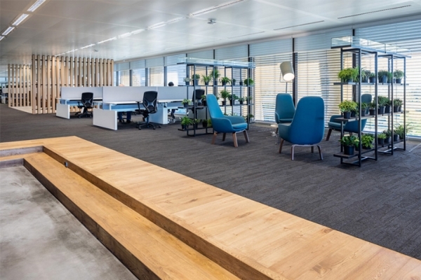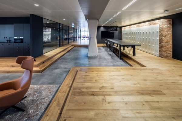 高低錯(cuò)落的地面豐富了空間形態(tài)。溫暖的木色、混凝土地面、暗色系墻面和家具,簡潔的材質(zhì)對(duì)比卻營造出豐富的視覺效果和時(shí)尚辦公空間。開放辦公區(qū)沿窗而設(shè),遠(yuǎn)處蔥蘢美景盡收眼底。
