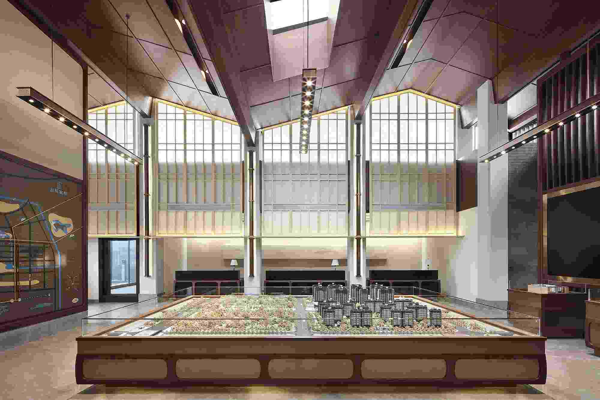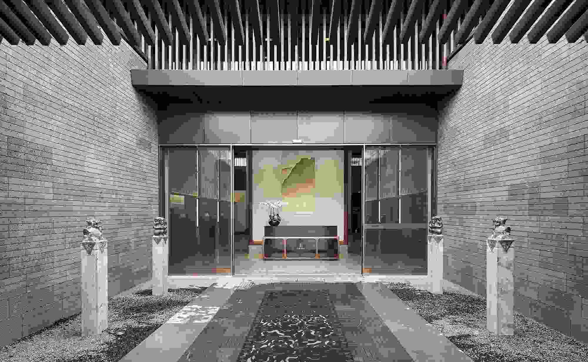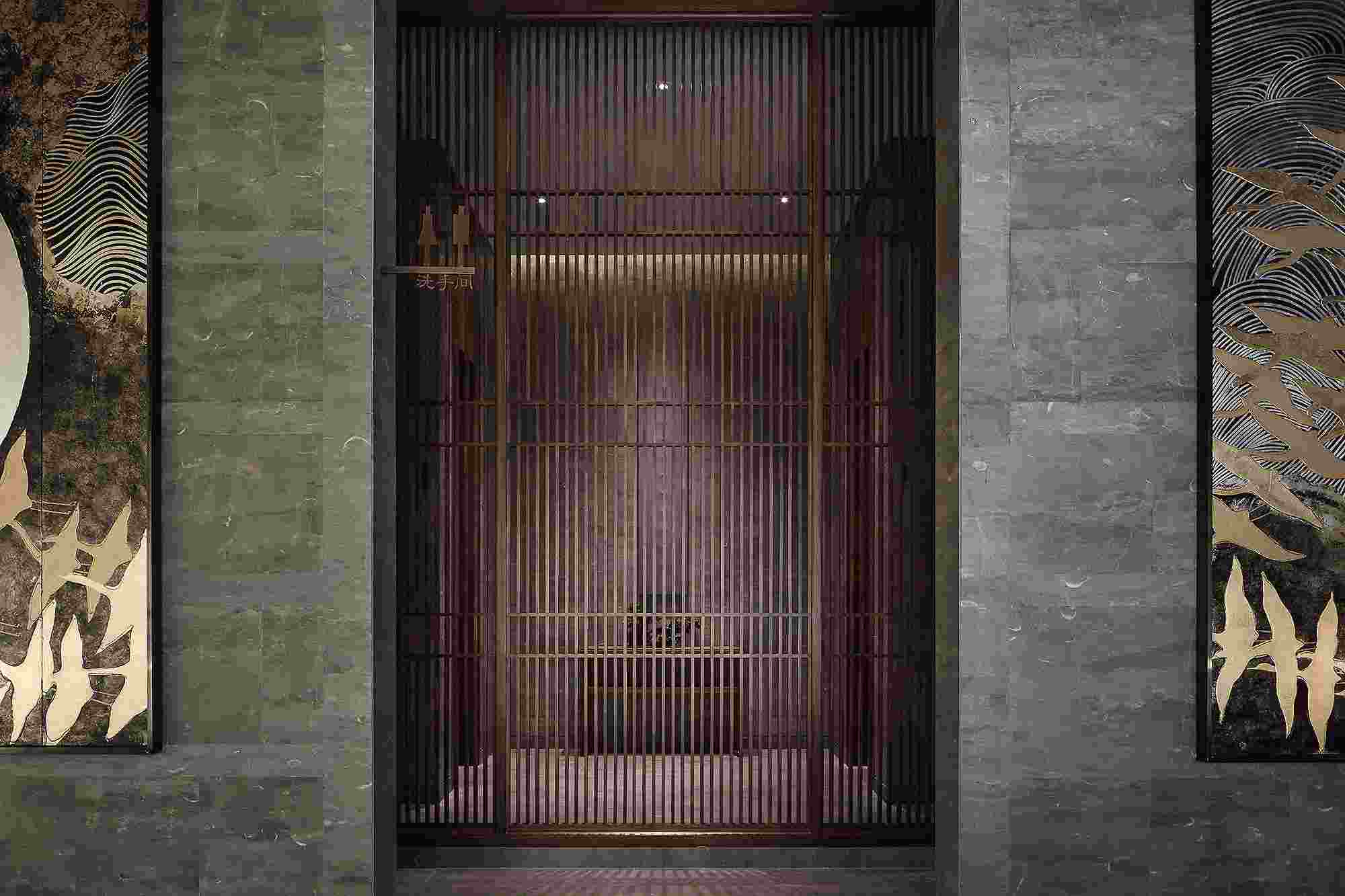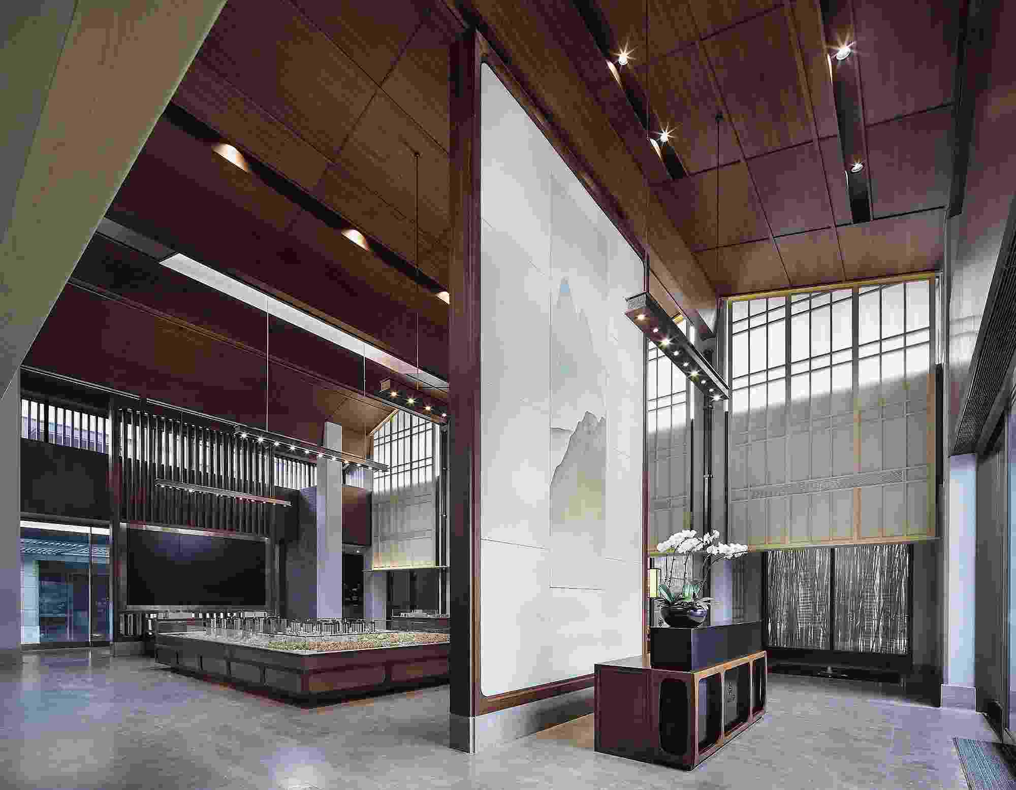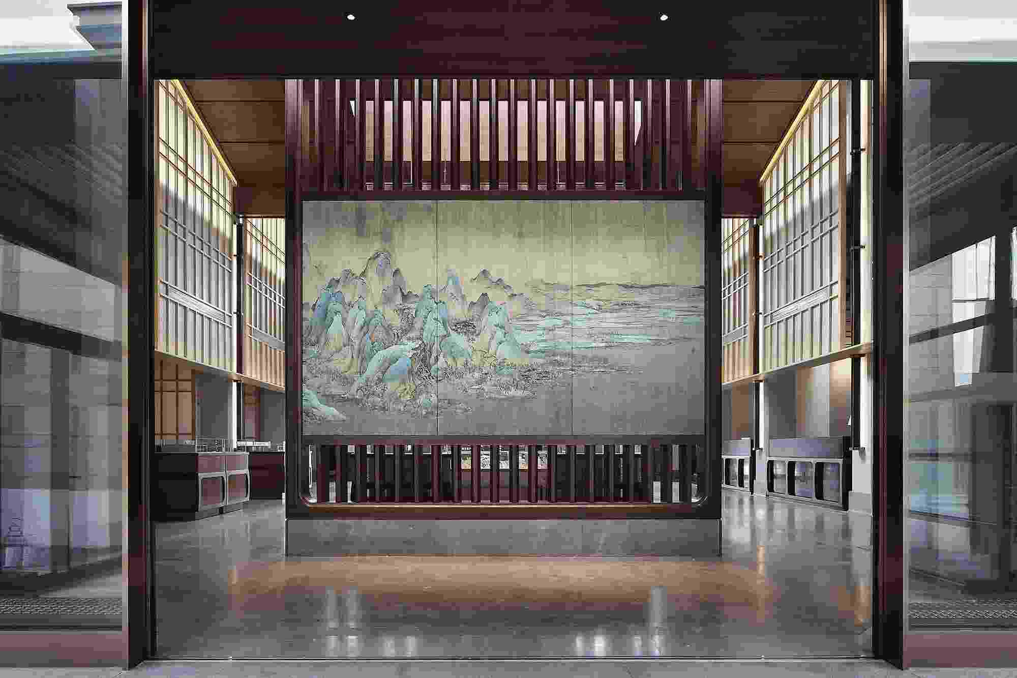 大廳內(nèi)高聳起伏的木質(zhì)屋頂結(jié)構(gòu)秩序井然,天井凌空處,將室外自在的光亮拽入屋內(nèi),吐故納新,渾然天成;天地相銜接的另一端側(cè)則是有序且虛實(shí)相間的木質(zhì)隔斷,山巒起伏的中式重彩畫屏斷與原先的照壁墻呼應(yīng),自是相得益彰,正應(yīng)了“淡妝濃抹總相宜”的寓意。