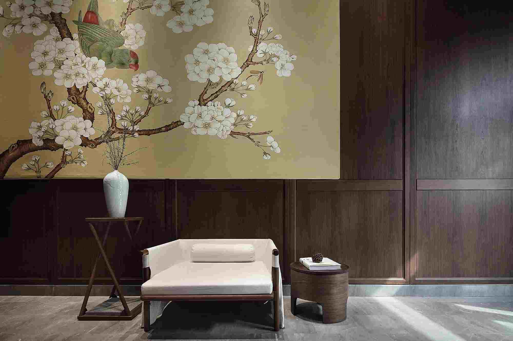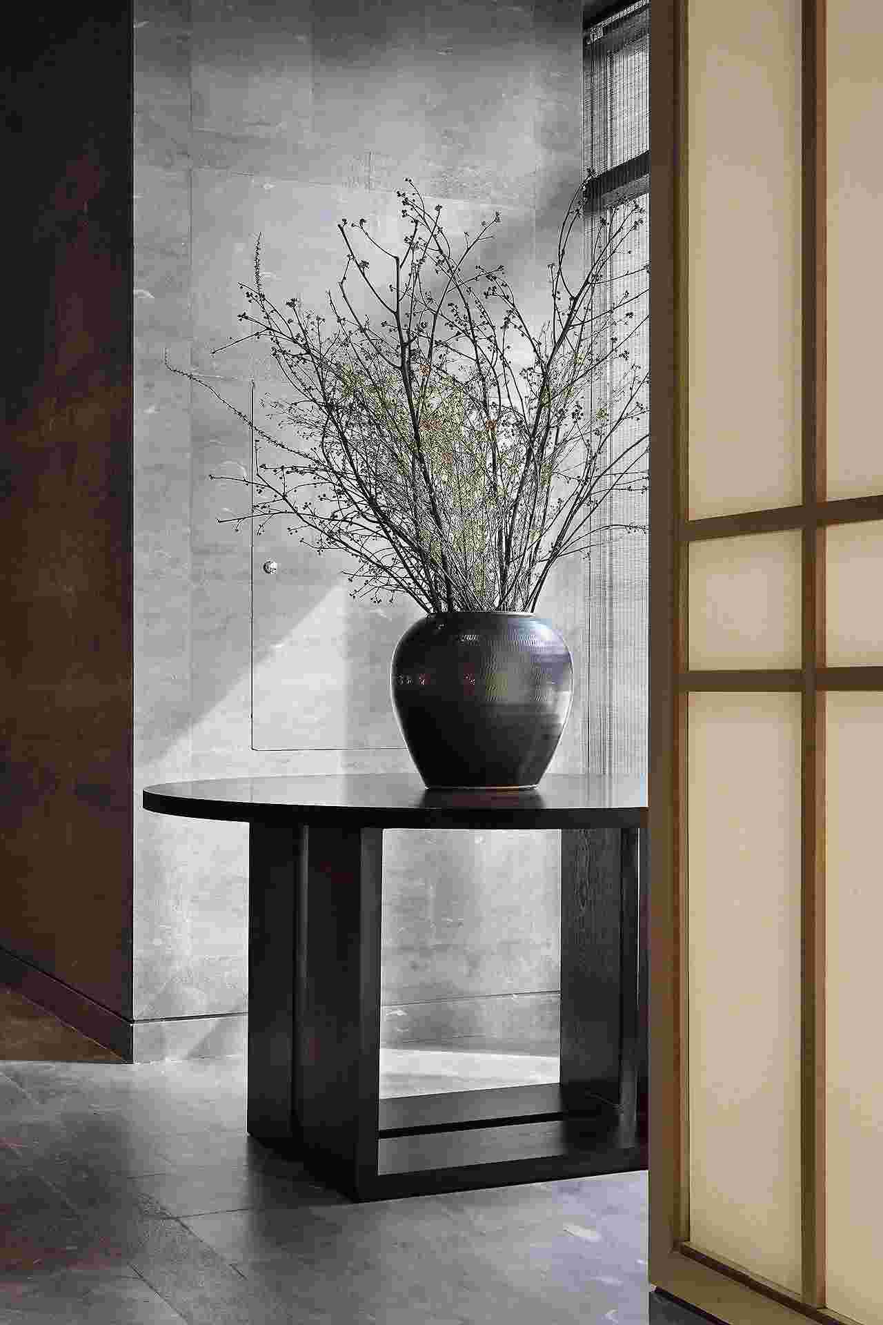迎賓臺(tái)正中端坐,臺(tái)上一蔟婷婷如素白蘭形同翩翩君子一般佇立,襯在一副同樣素面朝天,拔地而起的中式淡彩畫墻前,誰(shuí)能說(shuō)得清熟是畫中物,熟又是畫外音?此端景恰似中式建筑空間傳統(tǒng)意義上“照壁”的韻味,室內(nèi)景象在它的遮擋下則若隱若現(xiàn)。
