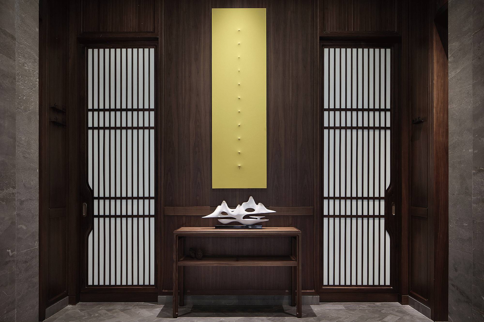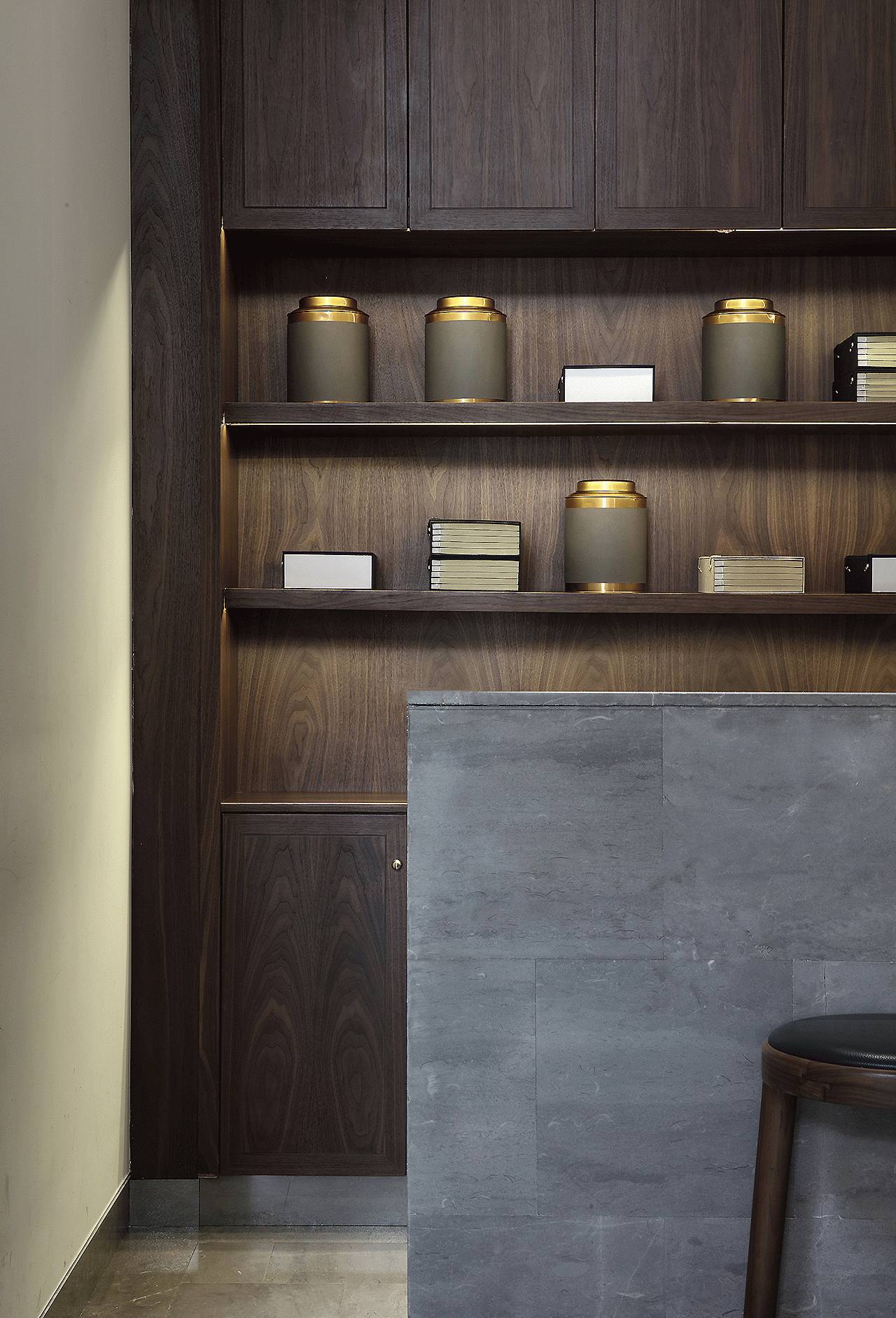空間主體青灰色系打底,一重一輕兩種木色經(jīng)緯分明的鋪陳于其中,因重復(fù)而形成的序列感讓空間肅然而理性;過(guò)道墻面,水池上方,一行金羽鶴正翱翔于海天之間,自得其樂(lè);而過(guò)道盡頭,一把椅,一張臺(tái),墻上杏花枝頭鸚鵡獨(dú)自嘻戲,空間主旨的待客之道信手拈來(lái)。