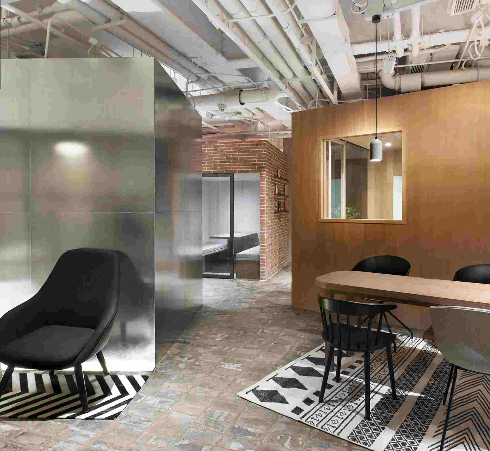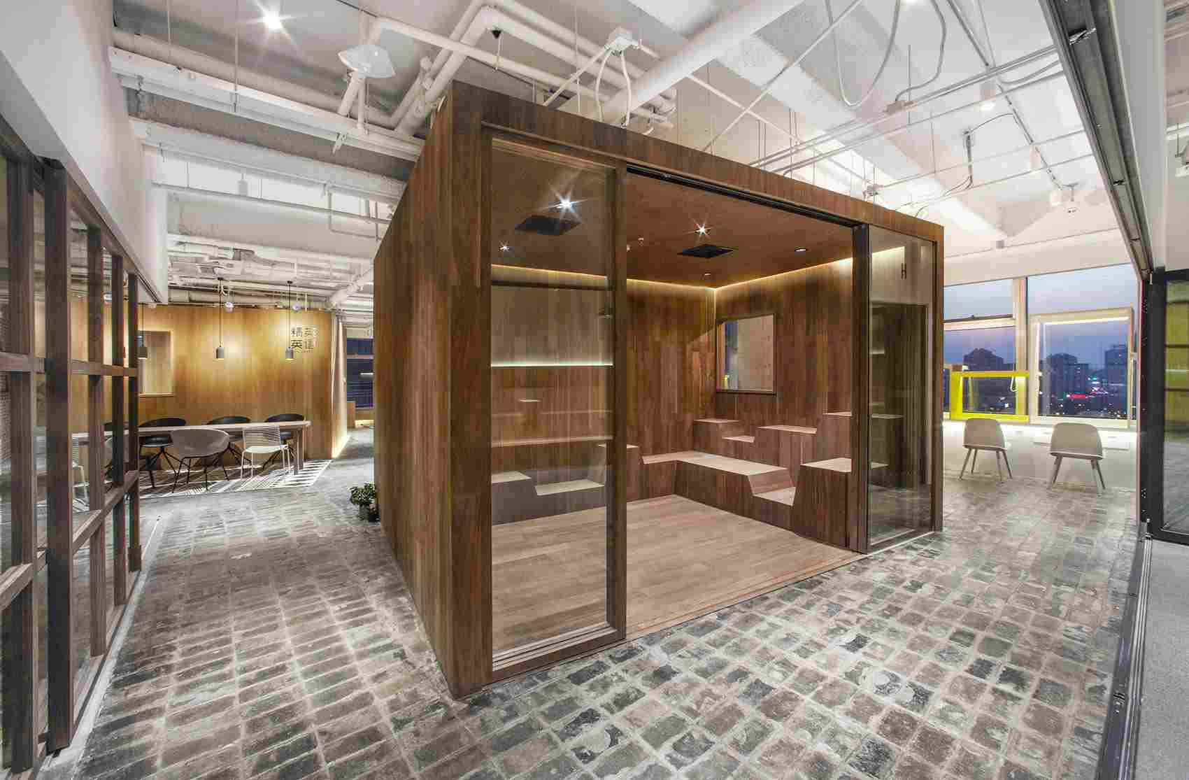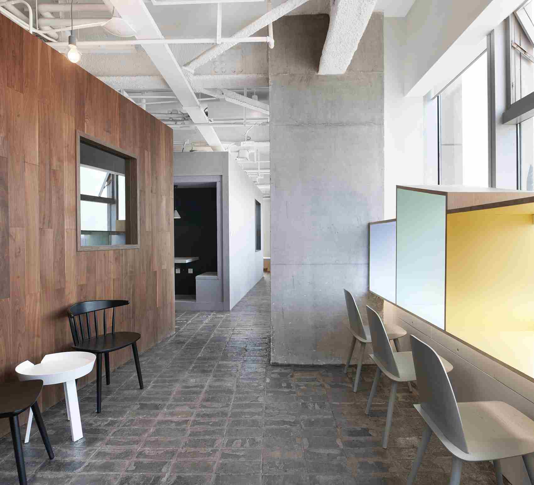 項(xiàng)目位于一座辦公樓內(nèi),業(yè)主租賃三個(gè)房間作為學(xué)校的辦公和培訓(xùn)區(qū)域。為了整合全部的空間的使用,設(shè)計(jì)師將其打通成為一整個(gè)房間。▼功能分區(qū)示意圖?本案的空間的設(shè)計(jì),與傳統(tǒng)的教室的設(shè)計(jì)有所不同。設(shè)計(jì)的核心概念為社區(qū),它由五個(gè)不同材質(zhì)的盒子,圍合出功能不同的區(qū)域空間,比如,書房,廚房,辦公交流等公共區(qū)域。房間內(nèi)則是教室,每個(gè)房間都擁有良好的視野和光線。▼“社區(qū)”是設(shè)計(jì)的核心概念,”??▼設(shè)計(jì)師將辦公樓層打通成為一整個(gè)房間??▼不同的盒子圍合出功能不同的區(qū)域空間???入口處,兩扇2000mm寬的大門設(shè)計(jì),當(dāng)玻璃門打開時(shí),室內(nèi)和走廊形成了相對(duì)開放的空間。房間使用了不同的材質(zhì),鍍鋅鋼板,水泥板,木板,紅磚,作為盒子的表面材料。地面則使用了灰磚,地面的破舊感和房子的不同材質(zhì)的對(duì)比,形成很大的反差,給人以強(qiáng)烈的視覺沖擊力。??▼寬闊的玻璃窗為教室?guī)?lái)良好的視野和光線?▼每個(gè)盒子使用了不同的材質(zhì),如鍍鋅鋼板、水泥板、木板、紅磚等??▼粗糙的灰磚地面和混凝土立柱帶來(lái)材料上的反差???
