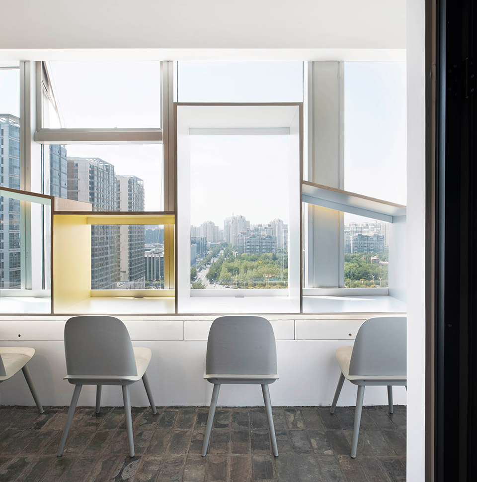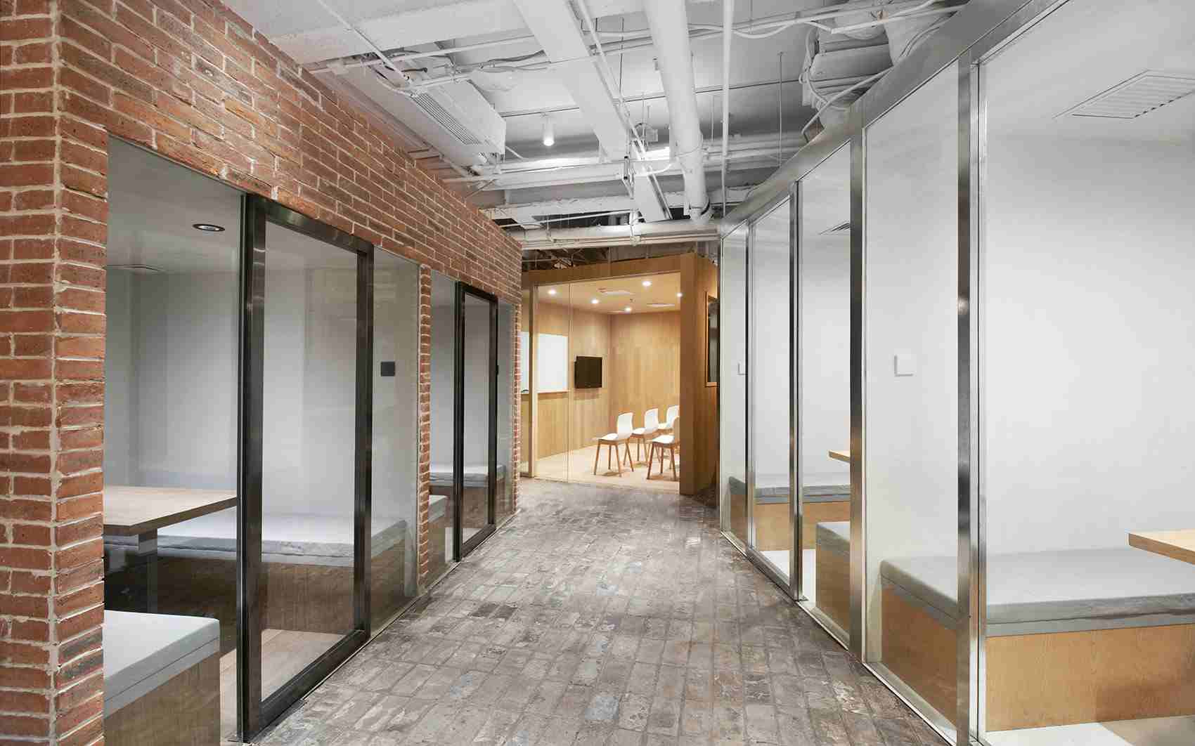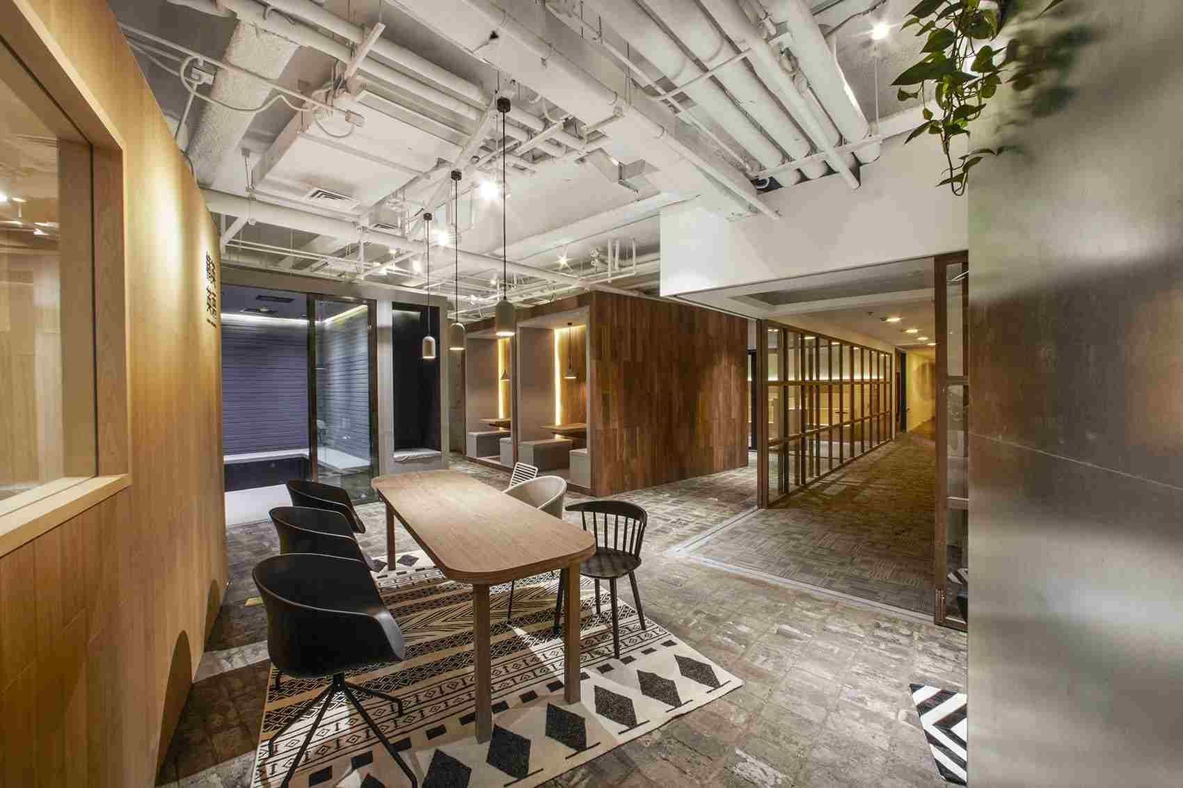 項(xiàng)目位于一座辦公樓內(nèi),業(yè)主租賃三個(gè)房間作為學(xué)校的辦公和培訓(xùn)區(qū)域。為了整合全部的空間的使用,設(shè)計(jì)師將其打通成為一整個(gè)房間。▼功能分區(qū)示意圖?本案的空間的設(shè)計(jì),與傳統(tǒng)的教室的設(shè)計(jì)有所不同。設(shè)計(jì)的核心概念為社區(qū),它由五個(gè)不同材質(zhì)的盒子,圍合出功能不同的區(qū)域空間,比如,書房,廚房,辦公交流等公共區(qū)域。房間內(nèi)則是教室,每個(gè)房間都擁有良好的視野和光線。▼“社區(qū)”是設(shè)計(jì)的核心概念,”??▼設(shè)計(jì)師將辦公樓層打通成為一整個(gè)房間??▼不同的盒子圍合出功能不同的區(qū)域空間???入口處,兩扇2000mm寬的大門設(shè)計(jì),當(dāng)玻璃門打開時(shí),室內(nèi)和走廊形成了相對(duì)開放的空間。房間使用了不同的材質(zhì),鍍鋅鋼板,水泥板,木板,紅磚,作為盒子的表面材料。地面則使用了灰磚,地面的破舊感和房子的不同材質(zhì)的對(duì)比,形成很大的反差,給人以強(qiáng)烈的視覺沖擊力。??▼寬闊的玻璃窗為教室?guī)?lái)良好的視野和光線?▼每個(gè)盒子使用了不同的材質(zhì),如鍍鋅鋼板、水泥板、木板、紅磚等??▼粗糙的灰磚地面和混凝土立柱帶來(lái)材料上的反差???