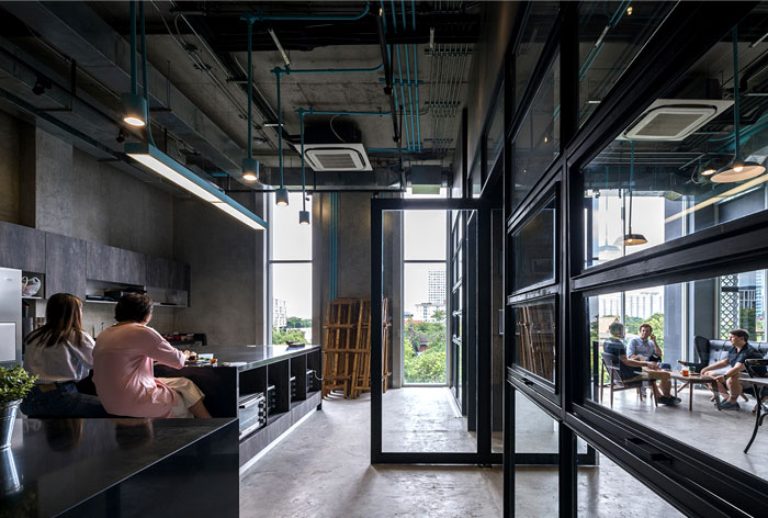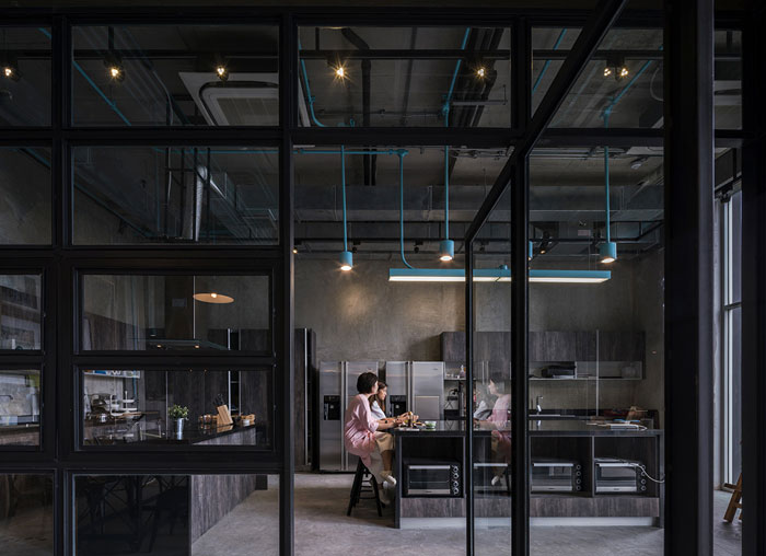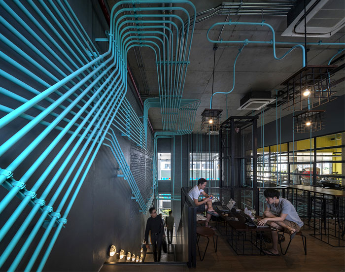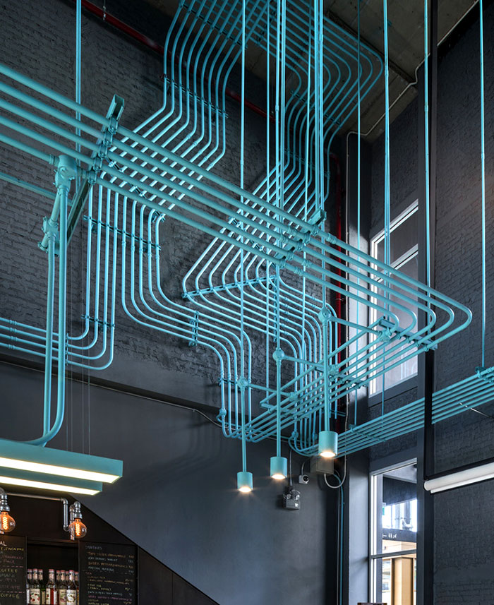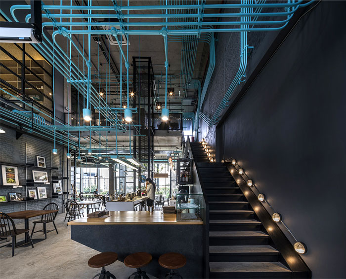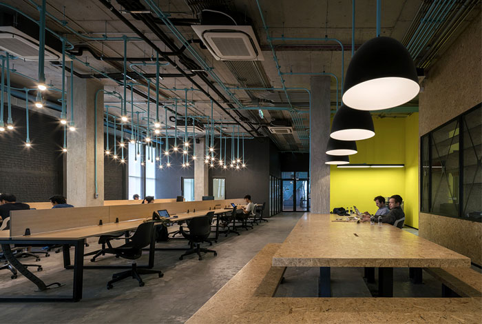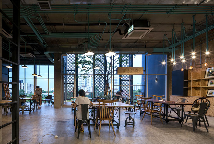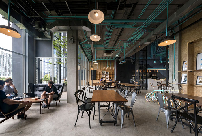 整個(gè) Co-Working Space 面積寬敞,以工業(yè)廠房的形式接待著來訪的客人,稍經(jīng)修飾的地面與裸露的混凝土立柱,帶來*為原始、粗獷的空間魅力,一層為咖啡廳,從售賣各種食品的吧臺(tái)到充滿工業(yè)感的桌椅,很難將它與工作空間聯(lián)想到一塊。????????????????