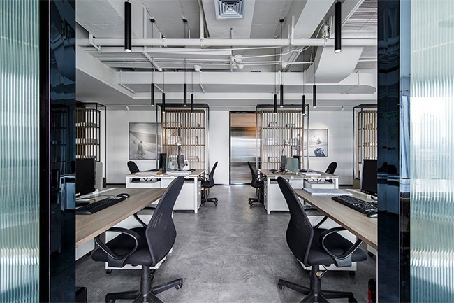 1、極簡風格550平辦公室設(shè)計案例:空間的形式做到了極簡,沒有任何多余裝飾,橡木豎向格柵、乳膠漆墻、半透明玻璃移門、平頂天花、開放式天花、橡木飾面的柜子及門扇概括了所有的造型。通過這些簡單的形式,以營造出通透流暢的空間,空間可以通過格柵門及玻璃門開放或密閉,從而滿足不同的使用需求。豎向格柵使得空間具有了多層次的穿透與流動,讓路徑串聯(lián)的每一個獨立空間可以借由半透明玻璃門產(chǎn)生視線上的交叉,而視覺的穿透還保證了空間的連續(xù)性。走廊和辦公區(qū)用格柵書架作為隔斷,整齊疊放的書籍與辦公桌上的植物使辦公環(huán)境更加輕松舒適。