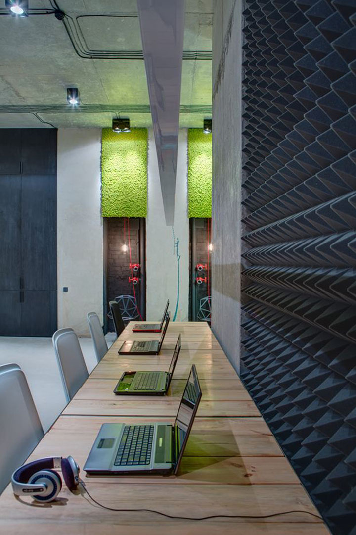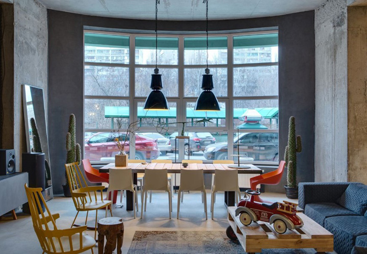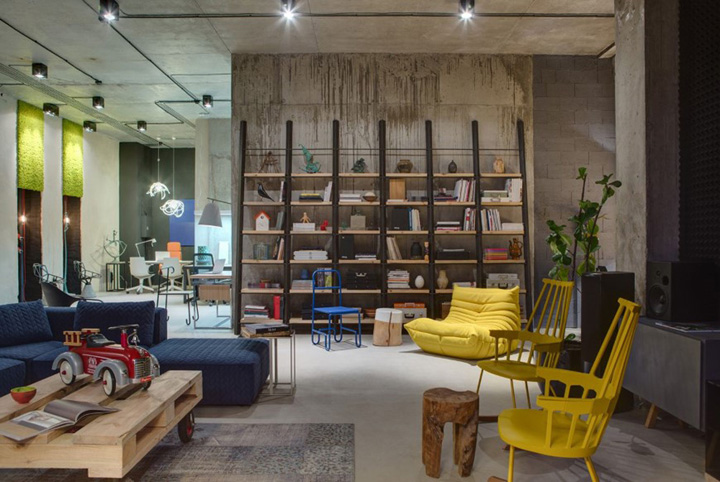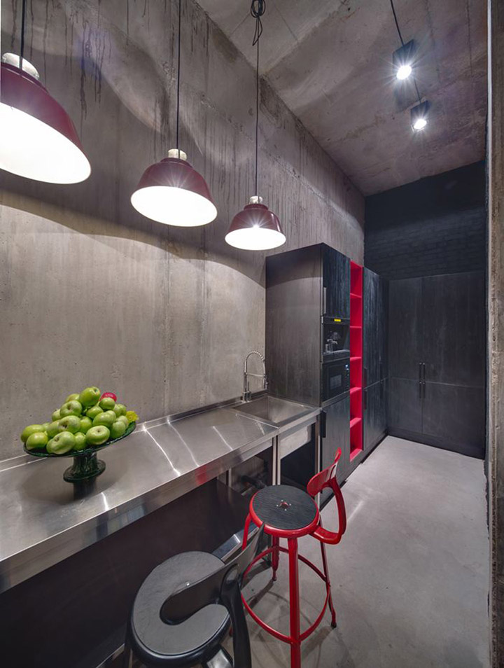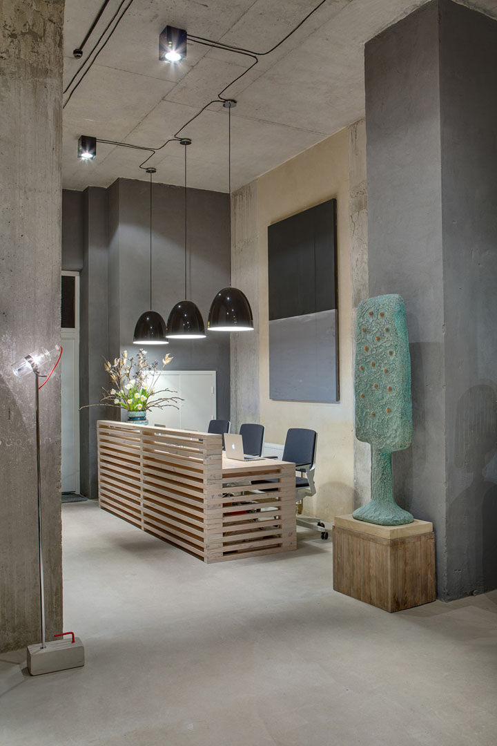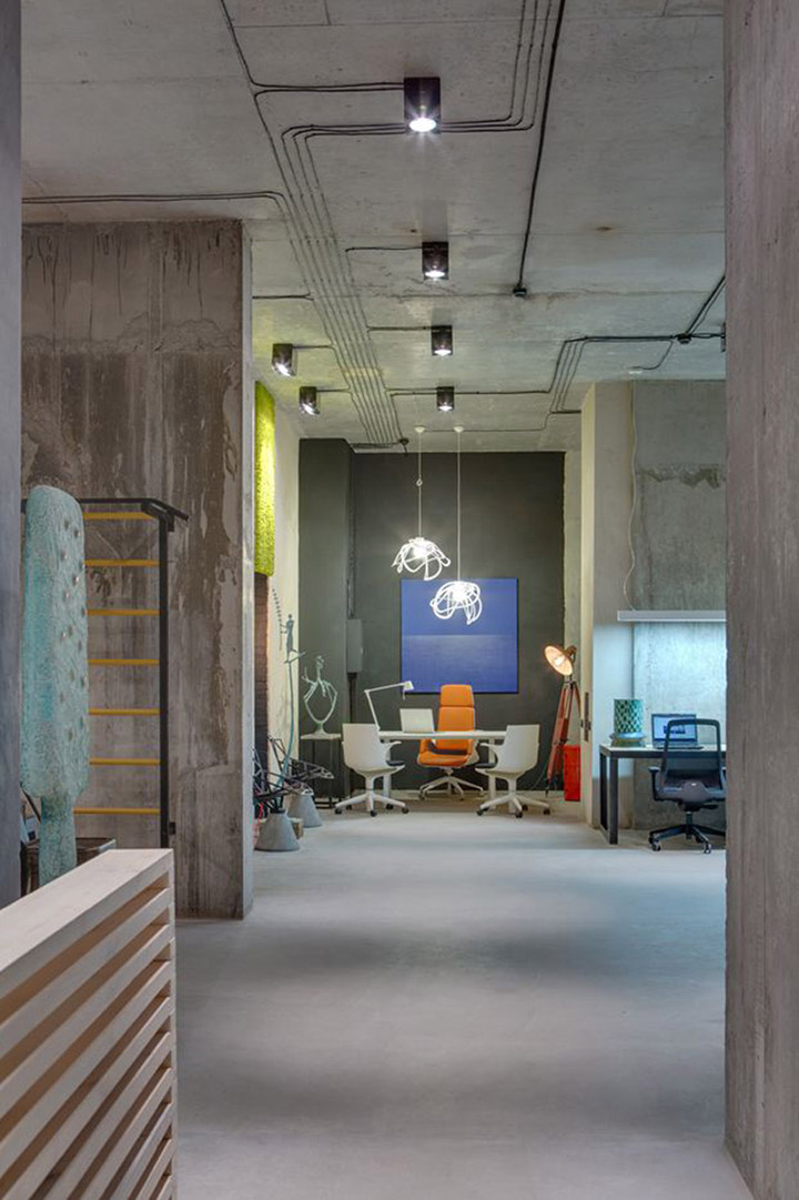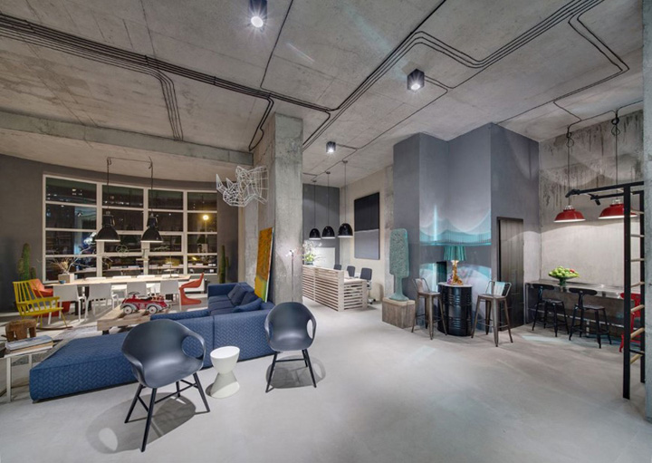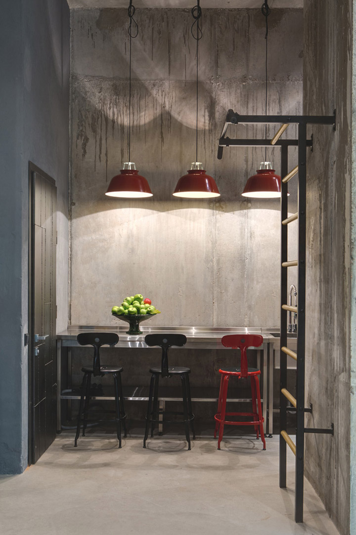 設(shè)計(jì)師盡量不去改變原有墻體構(gòu)造,并完全保留原有的水泥墻和水泥頂板。自然原始的材質(zhì)表面在藝術(shù)品的襯托下反而呈現(xiàn)出自然樸素的美感。頂面的管道布線經(jīng)過仔細(xì)編排,為原本平淡無趣的頂面增添了許多設(shè)計(jì)美感。